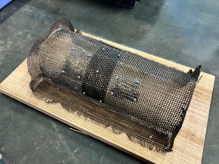 - こちらはかなり古い精米機の部品ですが、長年の使用に伴い網に穴が開いてしまったとのことで修理させていただきました。新しい部品は手に入りませんのでパンチングメタルをリベットで留めて修理完了です。